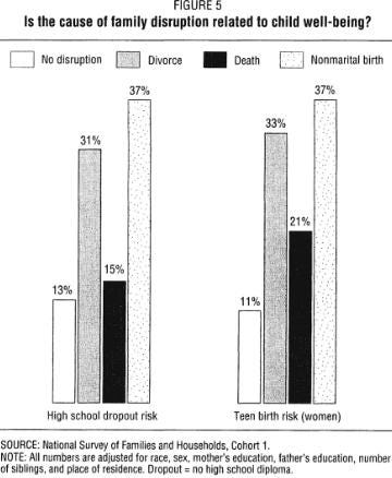 Both low income and single parenthood may in fact be correlated with poor outcomes for children because they are proxies for unmeasured parental characteristics. This suspicion is bolstered by the well-established finding that when single parenthood is a by-product of death rather than divorce or failure to marry, children do about as well as children living with two parents who have comparable incomes. (McLanahan and Sandefur 1994)