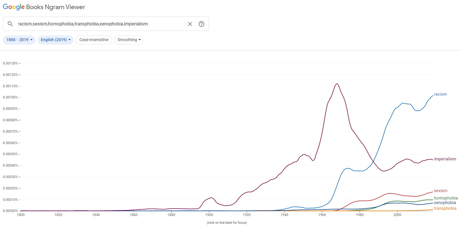 Herbert Spencer’s “From Freedom to Bondage” famously claims that “[T]he more things improve the louder become the exclamations about their badness.” And he offered a bunch of great examples. Inspired by Spencer’s insight, I recently turned to Google Ngram to look at long-run trends for six oft-named expressions of prejudice.