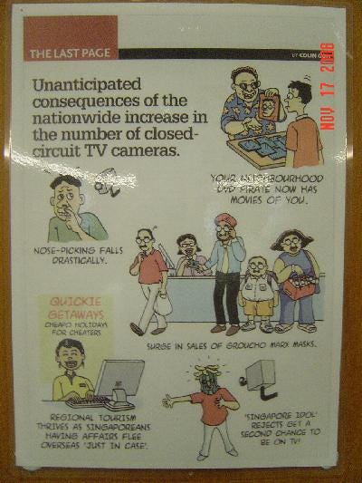 An Ode to Speakers Corner (mocking the regulation of their public speakers’ forum), Ode to Romancing Singapore (mocking the government’s natalist campaign), and this cartoon mocking the government’s use of security cameras: