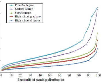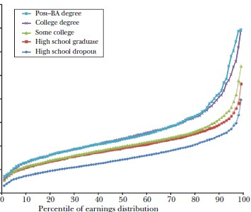 Here are two graphs of lifetime male income distribution broken down by educational attainment. One is for 1978, the other from 2008. I deliberately redact the years and dollar values to preserve the mystery.