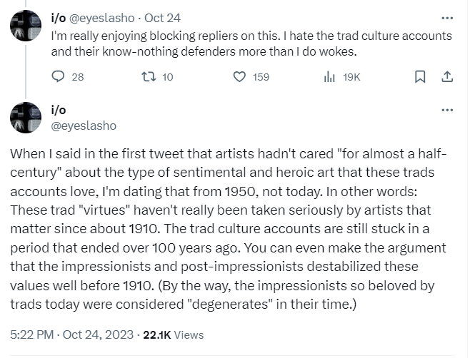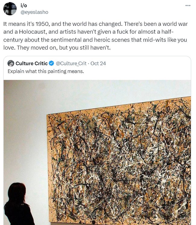 Since I strive to avoid hating anyone, I don’t hate wokes. But I can easily see why others would hate them for their absurd self-righteous dogmas. Why, though, would the fact that someone disdains most modern art and adores earlier art cause any reaction stronger than bemusement?