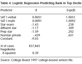 The odds of being in the top decile for a student in an exam star public school was only 24 percent of the odds of a student with the same SAT scores from a nonstar public school (the reference category). The odds of a student from a nonexam star public school being in the top decile was 30 percent of the odds of an equivalent-scoring student in a nonstar public school.