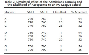 Attewell begins by using Dartmouth’s published admissions algorithm to run some simulations, noting that “there is a high degree of agreement between admissions decisions using this method and decisions made by other highly selective colleges that use the same basic inputs but in a slightly different way.”