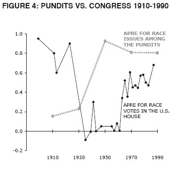 But in the 1950s, according to Figure 2, race has just fallen off the primary dimension in Congress. In Congress, race and economics were highly related from the Civil War up until 1921, when pro-business Republicans voted for anti-lynching laws. Among ideologues, the tie between racial sympathy and economic conservatism established in the antebellum period has evaporated by 1910. In the 1910s, race is orthogonal to economics among intellectuals. It largely remains so in 1930. Thus the intellectuals herald both the decoupling of race from ideology (1910 among pundits vs. 1921 to 1937 in Congress) and its new association with the other side (1950 vs. 1970 or later).