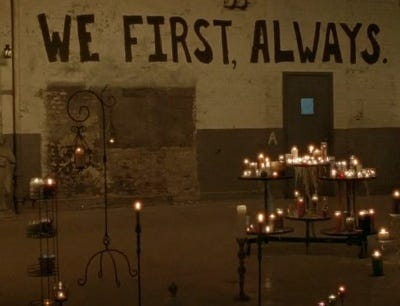 The victims naturally regard the Terminants as evil. Almost everyone who sees the show does the same: Yes, the Terminants are scared and hungry, but that doesn’t justify murder. The Terminants, however, are self-righteous. They even have an elaborate shrine (pictured above) that honors the dead members of their community and proudly displays their catechism. They’re self-conscious citizenists: “We first, always.” Therefore, cannibalism.