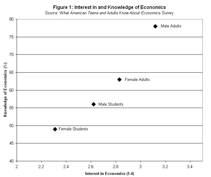 This figure, derived from the National Council on Economic Education’s What American Teens & Adults Know About Economics survey, shows the relationship between how interesting people think economics is and how much they know about it. Notice that the rank order matches up neatly: Male adults know the most about economics and are the most interested in it, followed by female adults, male high school students, and female high school students.