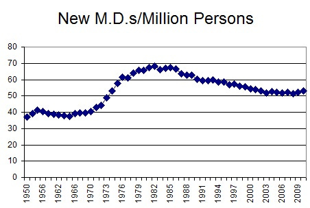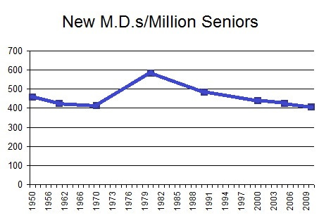 If you peruse this table, you’ll discover that total number of new M.D.s per year has been virtually flat for 30 years. During this period, population increased over 30%. As a result, the new M.D./population ratio has declined for decades.