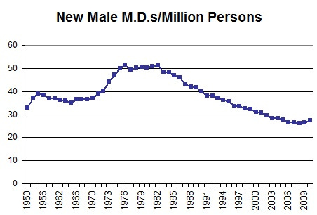 My point, of course, is not that women have “stolen” men’s places in medical school. My point, rather, is that that draconian government entry barriers are the only credible explanation of the facts. Why else would the number of male doctors have fallen so far relative to demand? Infinitely inelastic demand for medical services? A massive decline in the talent of male applicants to medical school?!