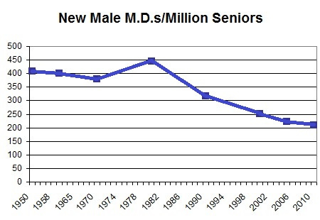 If you’re not horrified, consider that the senior population – doctors’ best customers – increased by over 50%. As a result, new M.D.s per senior fell by about a third over the last three decades: