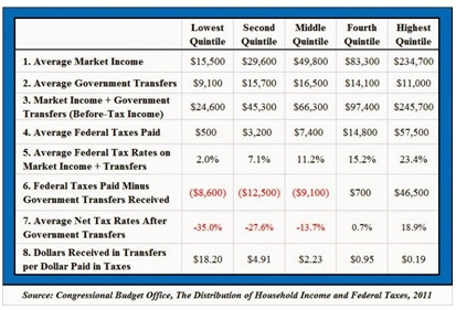 If you calmly peruse the table, however, a stranger pattern emerges – a pattern neither liberals nor conservatives will expect. Look closely. While taxes are highly progressive, transfers have an upside-down U-shape. Households in the middle quintile get the most money. The richest households actually get more money than the poorest. Think about how many times you’ve heard about government’s great mission to “help the poor.” Could there be any clearer evidence that such claims are mythology?*