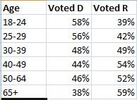 Democrats only won the two youngest age brackets. In twenty years, they’ll be in their thirties and forties – and by Arnold’s logic, their elders in their fifties, sixties, seventies, and beyond will still be Republicans. And who knows how new young voters will align themselves in the 2030s? For all we know, we’ll see a re-run of the 1980s, when young Republicans horrified their boomer parents.