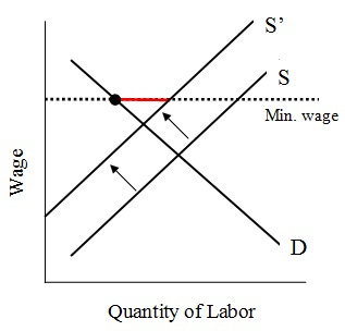 The answer may surprise you. The supply of labor falls to S’, of course, because free money makes workers less eager to work. But unless welfare is ample enough to push the market-clearing wage above the legal minimum wage, welfare has no effect on the wage or quantity of hours worked! Why not? Because thanks to the minimum wage, jobs are rationed. There’s still a line of eager applicants even if the marginal payoff for work declines.