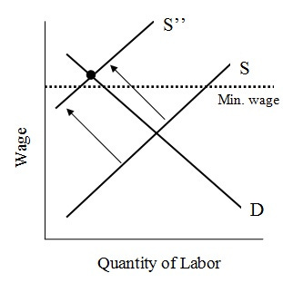 Notice: Sufficiently high welfare makes the minimum wage irrelevant. The market now clears at the intersection of the old demand curve D and the new supply curve S”. Since the intersection exceeds the minimum, the minimum has no effect. Thanks to welfare, employment is low. But whatever unemployment you see is voluntary.