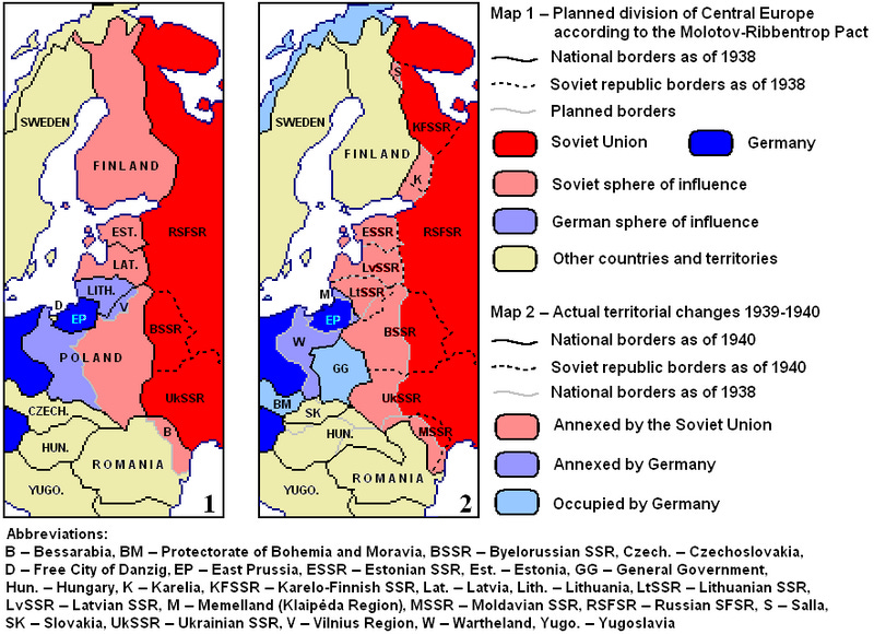 Even many people with little sympathy for the Soviet Union admire its “heroic” role in World War II. What all too few people realize is that for the first twenty-two months of World War II, the Nazis and the Soviets were allies. Under the auspices of the Molotov-Ribbentrop Pact, Hitler and Stalin partitioned the countries that lay between them, beginning with Poland. Here’s a nice map showing the original Nazi-Soviet deal, and its subsequent revision: