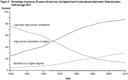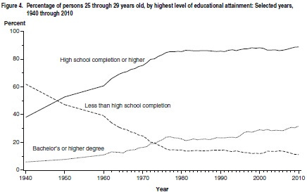 Why has the return to education increased so much in recent decades? The simplest explanation is that the supply of well-educated workers just isn’t keeping up with the demand. Indeed, many claim that American educational attainment has been stagnant for decades. This figure from the 2010 Digest of Education Statistics seems to back the stagnationists up: