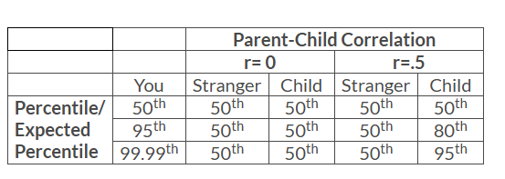 Now suppose that the parent-child correlation on the trait you picked is exactly zero. Then no matter what you’re like, you should expect your kids to be at the 50th percentile. If you’re normal, that’s a pretty good deal; at least on average, your kids will be just like you. But the weirder you are, the less your kids will typically resemble you. Even if you’re at the 95th, 99th or 99.99th percentile, you can expect your kids to be perfectly average. In a world of zero parent-child correlation, weird people have little in common with their children.