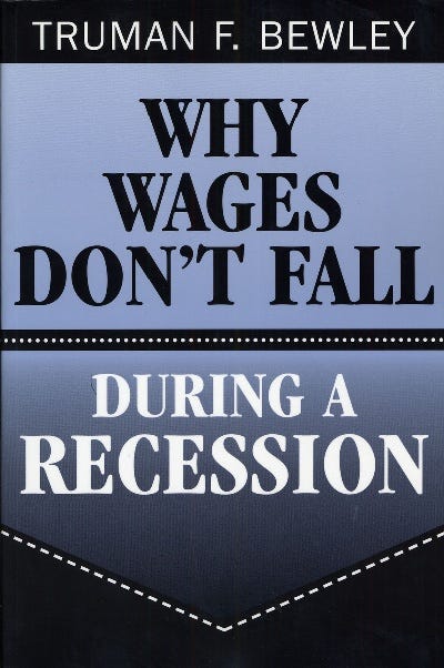 Many economists, especially nowadays, will be baffled by Bewley’s thoughtful employer interviews. Where’s the identification? Where’s the calibration? The problem is theirs, not his. Like every man of good sense, Bewley looks for his car keys where he dropped them. His goal is to help us answer questions we care about, not convince us to care about whatever questions he can decisively answer.