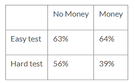 The big result: “Choice behaviour changes from overconfidence to underconfidence when the task changes from easy and familiar to non-familiar. This effect is significant when monetary payments are at stake and weak when they are not.” Percentage of subjects who voted for Option #1: