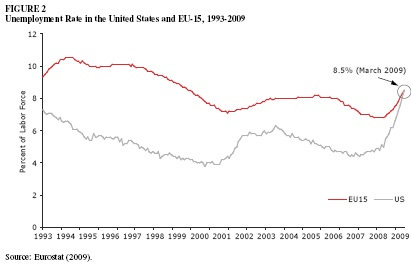 Now take another look at the CEPR graph. During the dot-com bust, U.S. unemployment remained below Europe’s, but it clearly rose faster. Isn’t this further evidence that the mainstream case against European labor market regulation is overstated?