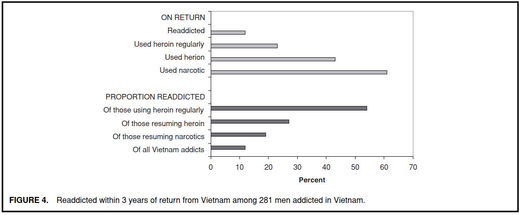 Nevertheless, “addiction” largely ceased after return to civilian life. Just 8% used heroin at all — and contrary to stereotypes, casual use dominated: