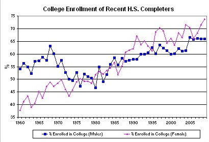 For women, enrollment is close to a straight line. Men, however, reach a local maximum of 63.2% in 1968. The percentage then plunges down to 49.4% in 1974, where it hovers for eight years. Male enrollment doesn’t pass its 1968 peak until 1997!