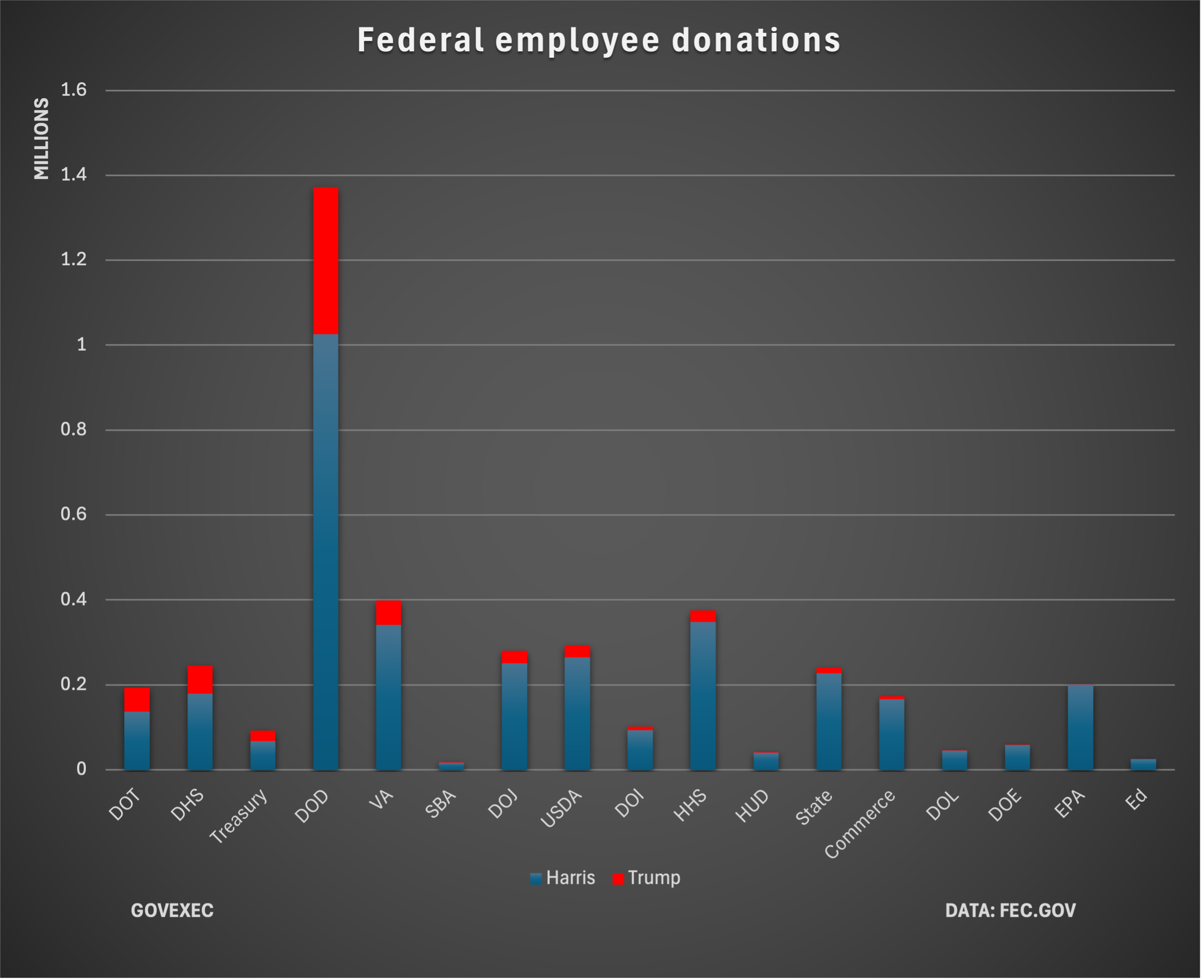Furthermore, in the eyes of most federal workers, Trump is ideologically and personally odious. While I couldn’t find any decent data on federal workers’ Democrat/Republican ratio, federal workers’ campaign contributions skew quite left. Indeed, setting aside the military, federal workers look almost monolithically Democratic: