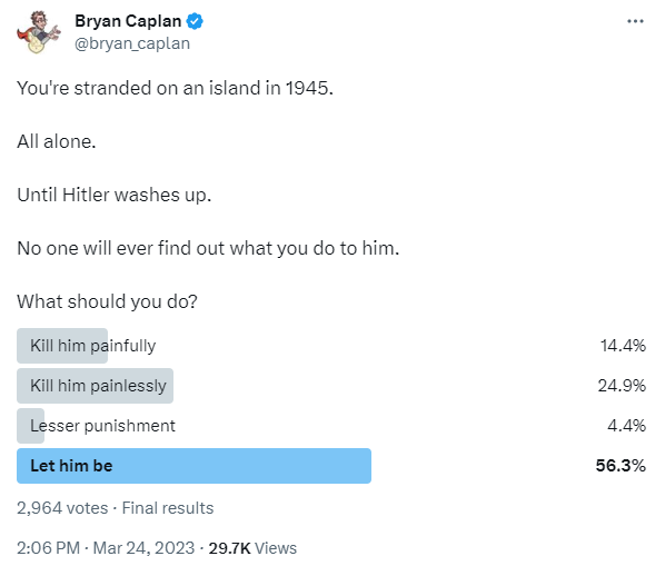 Now suppose you’re a consequentialist. How do you justify making criminals suffer? The party line is: “Making criminals suffer is, in itself, always bad. The only available moral justification is deterrence: The suffering you save must exceed the suffering you inflict.” My twitter readers even buy this story for Hitler himself: