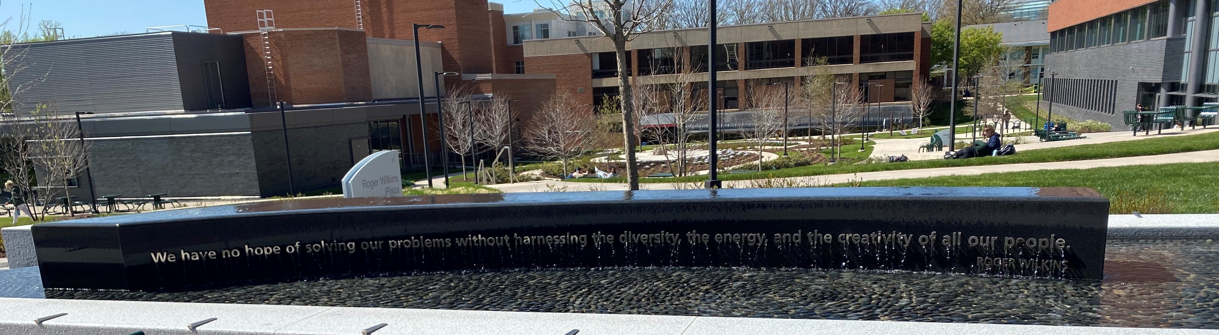 At the heart of George Mason’s campus lies a fountain with a big inscription. The quote, by Roger Wilkins, reads: