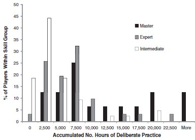 Contrary to the popular “talent” view that asserts that differences in practice and experience cannot account for differences in expert performance, we have shown that the amount of a specific type of activity (deliberate practice) is consistently correlated with a wide range of performance including expert-level performance, when appropriate developmental differences (age) are controlled. Because of the high costs to the individuals and their environments of engaging in high levels of deliberate practice and the overlap in characteristics of deliberate practice and other known effective training situations, one can infer that high levels of deliberate practice are necessary to attain expert level performance. Our theoretical framework can also provide a sufficient account of the major facts about the nature and scarcity of exceptional performance. [emphasis mine]